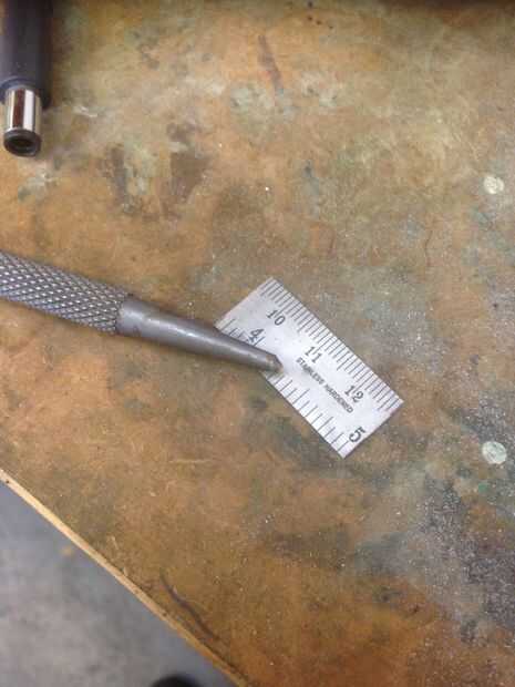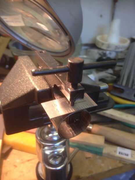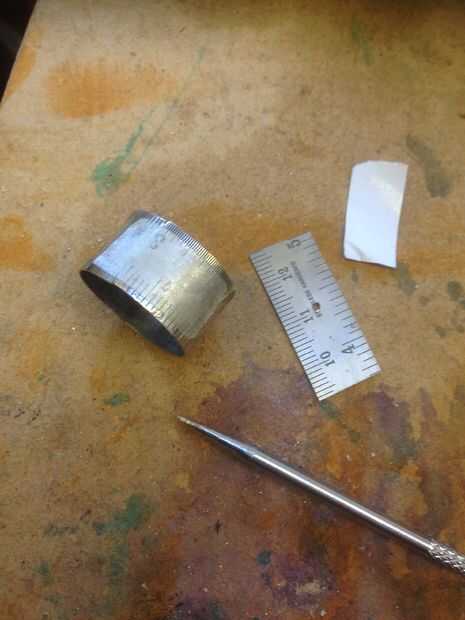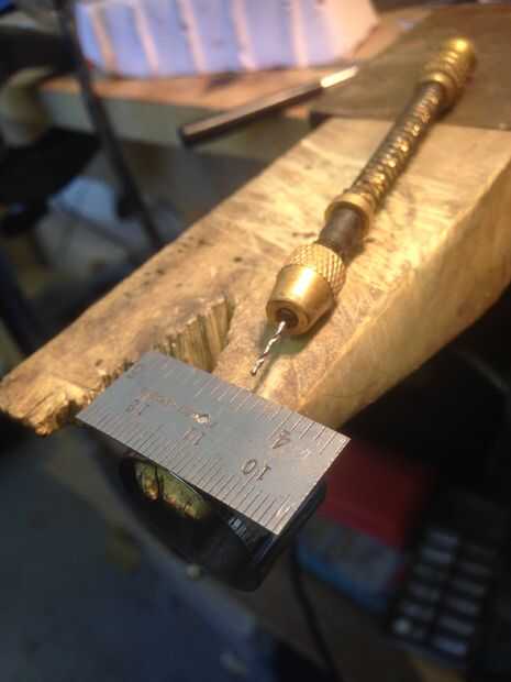 Para fijar la regla a la parte superior del anillo usé un remache de cobre. Primero había marcado el agujero en la parte plana y lo perforó. Entonces usando cinta de doble cara, alineado con el anillo y usando un taladro de archimedes, comenzó un agujero piloto a través del anillo y remató con el taladro de banco. Luego usé un setter del remache para colocar el remache.