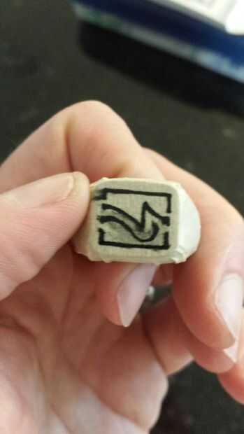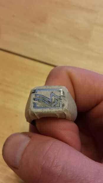 Colocar una tira de cinta sobre la superficie del anillo, dibujé el diseño invertido sobre la superficie plana. Entonces, usando y cuchilla Xacto yo cuidadosamente (y me refiero con cuidado) cortar el diseño de la cinta. Dondequiera que está mostrando el metal será grabada, así que sólo lo que quieres es tallada en la cinta.