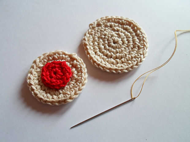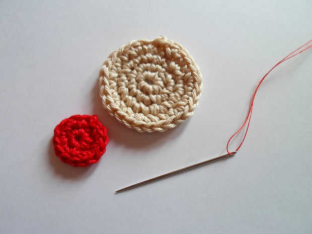 Coser en primer lugar el círculo rojo (nariz) en el centro del pequeño círculo beige con hilo rojo.