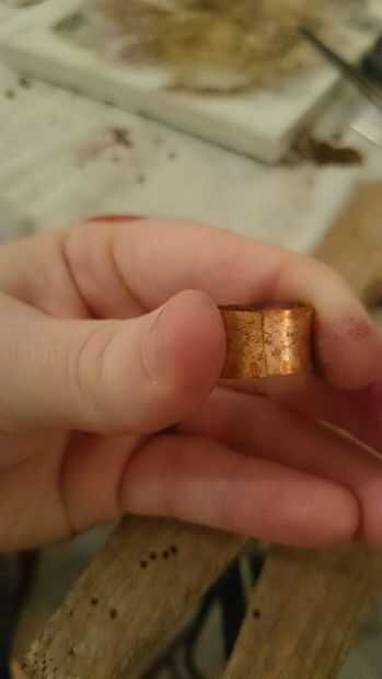 Mida el dedo para un ajuste apretado, como el anillo se estirará como usted martilla.