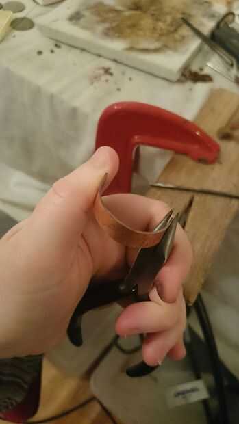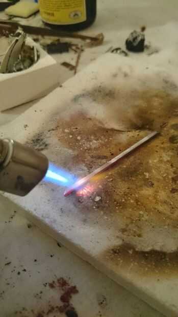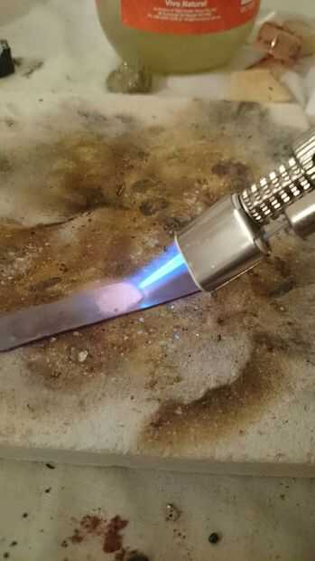 Recocido de los metales. Esto significa que calentar con el soplete hasta que todo el tiempo que una llama de color amarillo/naranja sale del metal, antes de que el metal se ilumina en rojo. Déjelos enfriar, o 'apagar' en algo de agua. Recocido se ablandan los metales para hacerlo más fácil doblar.