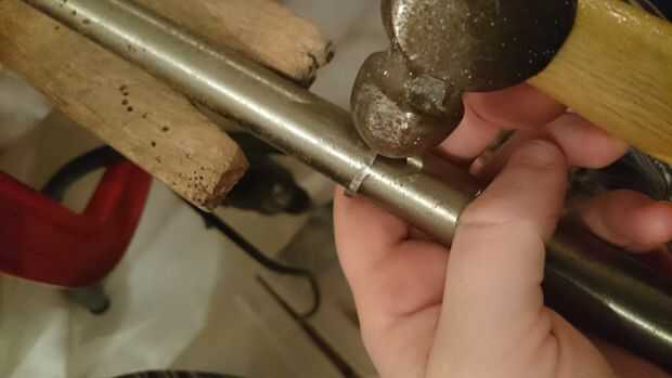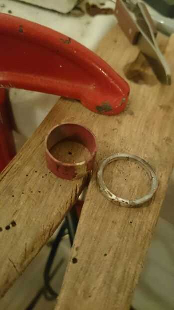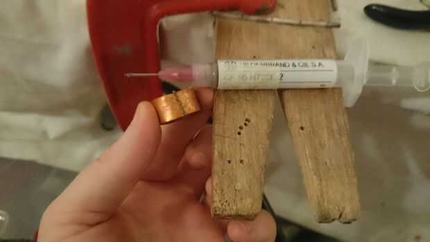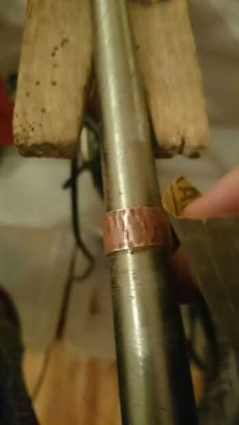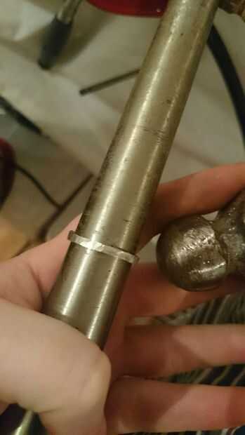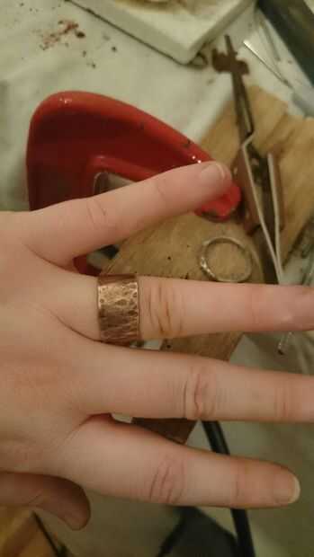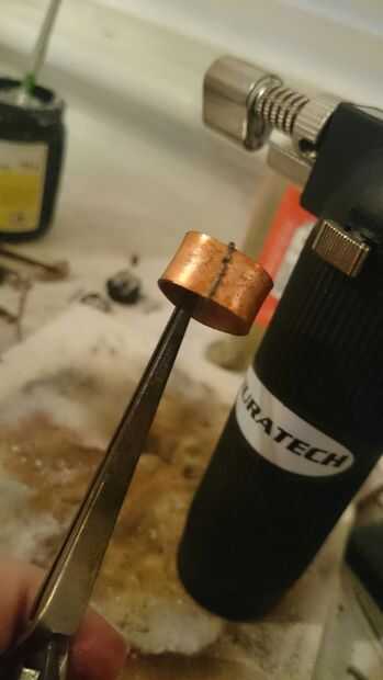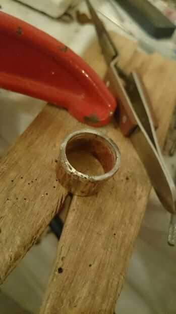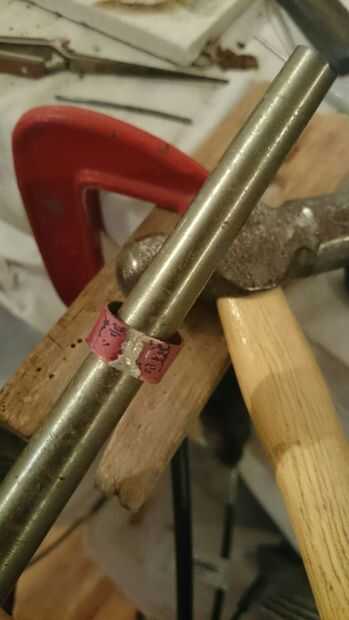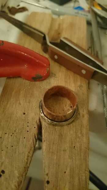 Ahora viene la puesta a punto; probar el anillo y asegúrese de encaja, si no, seguir martillando sobre el mandril hasta que has estirado hacia fuera suficiente. Este es un proceso que tienes que ser paciente y tener cuidado con, comprobando constantemente si es el mejor tamaño para usted. Cuando es apropiado, le dan una luz de arena (o un pesado si no te gusta el aspecto rugoso) y después compruebe el tamaño del anillo del cono. Usted tendrá que estirar éste hasta que es apenas más grande que el anillo de cobre por lo que puede girar alrededor de él.