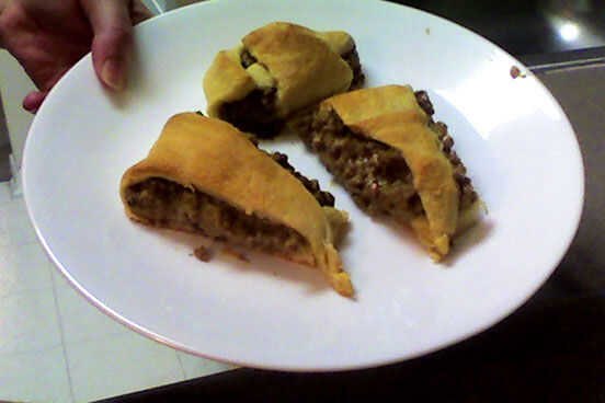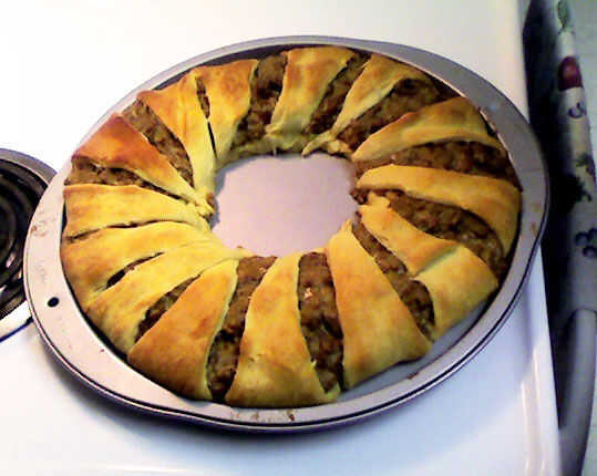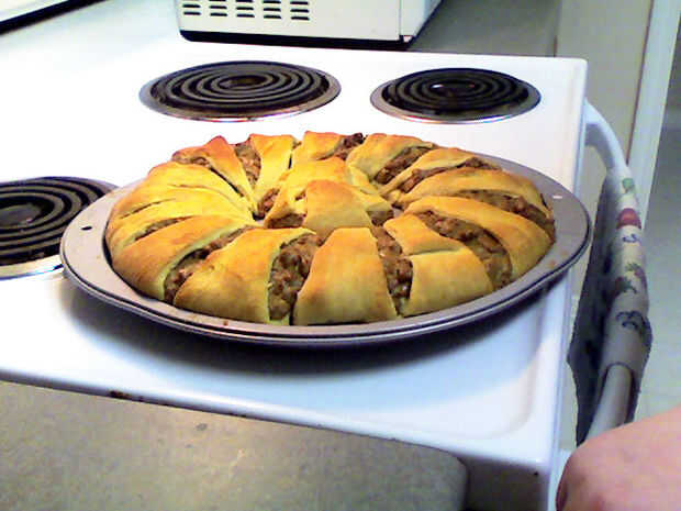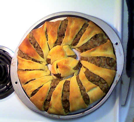 That's it! Ahora usted debe tener un anillo perfectamente dorado y delicioso taco! Corte donde se separa cada croissant y sirva. Para la presentación, podría cortar la parte superior de un pimiento y llenar hasta la de la salsa. Coloque el anillo de tacos en un plato bonito con el pimiento en su interior. Esta noche, es sólo yo y el hombre, así que no estoy preocupado por presentación. Superior de cada sección con crema agria o queso extra si así lo desea. ¡ Disfrute!
