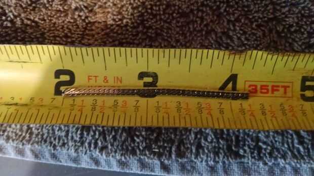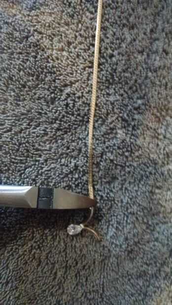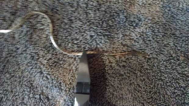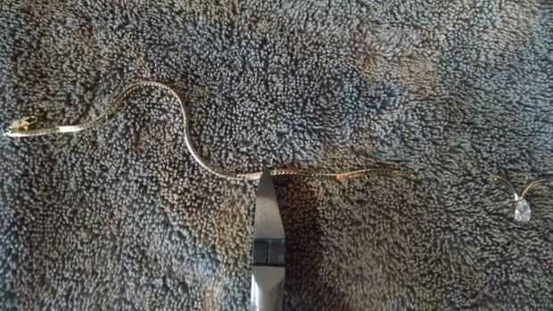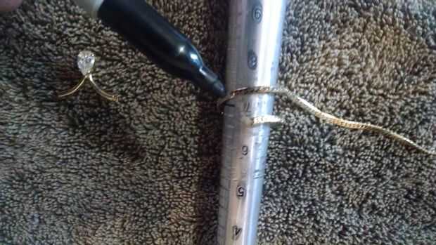 Corte la cadena tan cerca del colgante. Medir longitud de Mandel y marca. Corte en marca. Un anillo de tamaño 7 mide 2 1/4 pulgadas de largo.