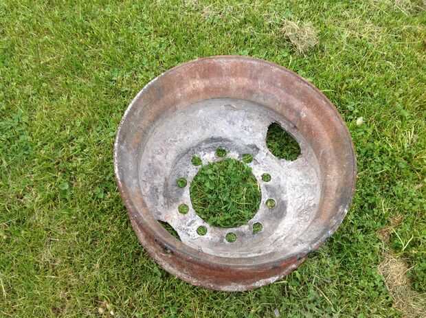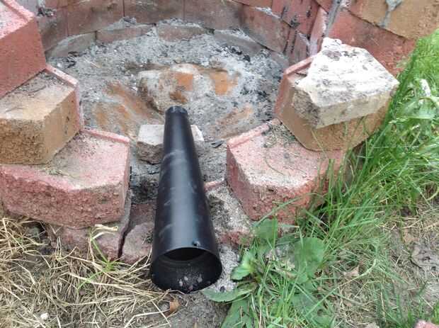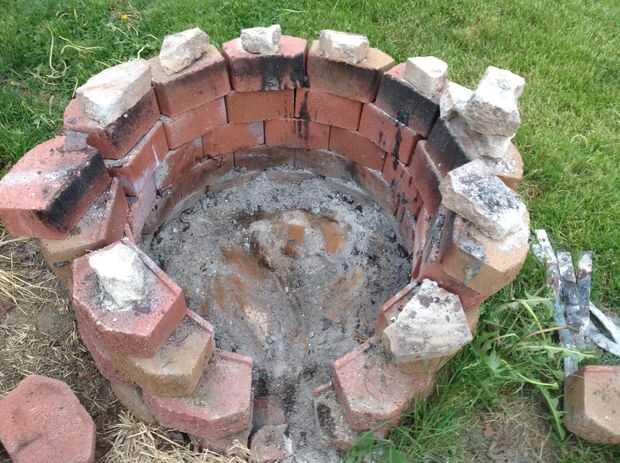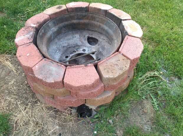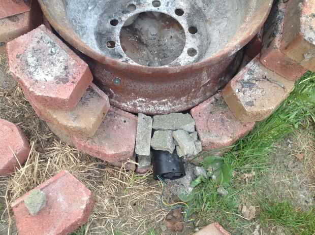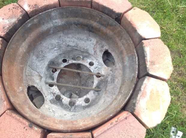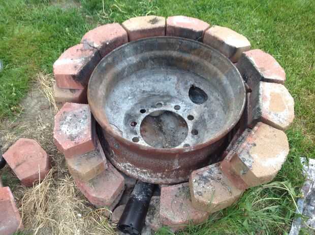 Engañé un poco aquí. Ya tenía la estructura general de mi anillo, construido, por lo que derribaron justo lo que necesitaba para añadir el fogonero. El anillo que sujeta la madera es solo una llanta de carro viejo grande. Creo que es de una camioneta de cubo o algo. Me senté sobre unos ladrillos en la parte inferior para que aire puede entrar desde la parte inferior en el centro. Puse el extremo pequeño del silenciador de escape en el centro de la llanta. Entonces pillado un pequeño ladrillo para "nivelar" el espacio vacío alrededor del silenciador. Luego construí hasta los ladrillos alrededor del borde. ¿Tenía unos pedazos de varilla de acero (barras de refuerzo? Diablos si yo sé!) en mi nave, así que puso a través del orificio central del borde para mantener registros caigan tapar el agujero.
