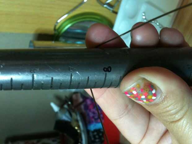 Recoger su mandril o marcador y enrolle el cable alrededor. Mina tamaño tamaño 8 pero necesito tamaño 7. Lo pongo en ocho es que los Agregue todos sus granos a la base que el anillo se contrae debido al tirón va a hacer con la 0.3 del cable que encajona el la base del anillo. Y también las perlas por lo de la habitación dedo necesidades. Por lo tanto esperar el anillo para bajar una talla.