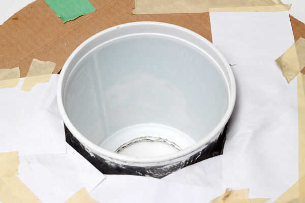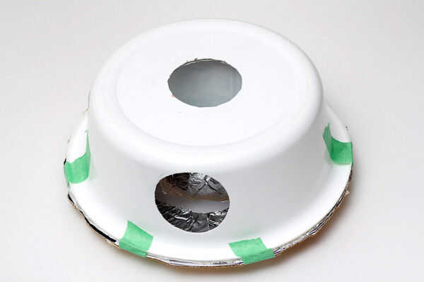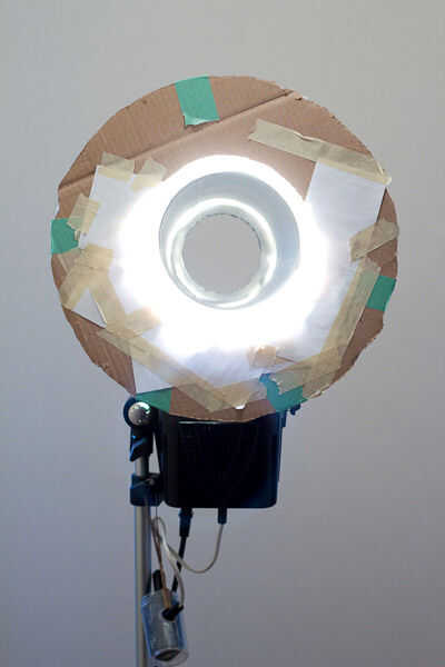 Pegamento caliente el envase de helado a la cuenca y del papel de aluminio el interior. Hacer un donut cartón para cubrir la cuenca, dejando sobre una pulgadas de espacio libre alrededor del envase de helado. Papel de un lado de la cartulina y cinta adhesiva en la cuenca. Une el modificador flash acabado del anillo a un Alien Bee estroboscópico. A veces ayuda a inclinar la luz estroboscópica directamente hacia arriba.