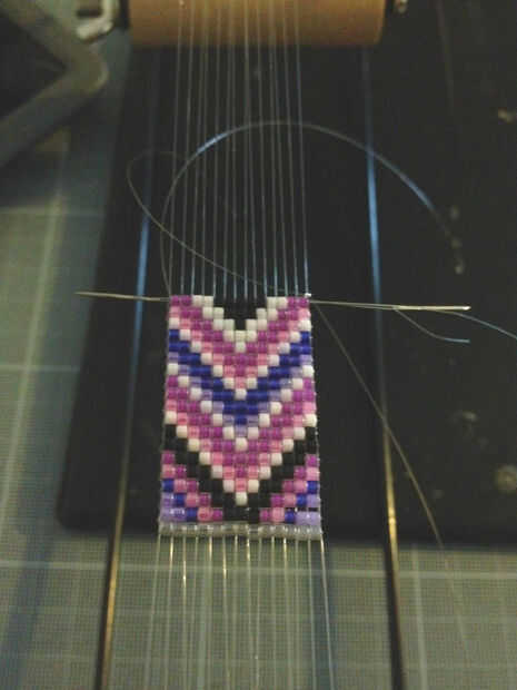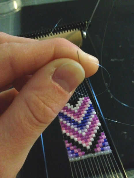 Para hacer la otra parte del patrón, cortar una longitud de cable, un nudo en el hilo primero a la derecha de tejer y pasar la aguja en la línea de granos del centro.