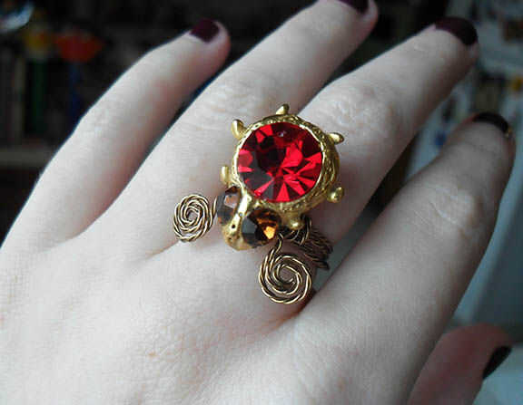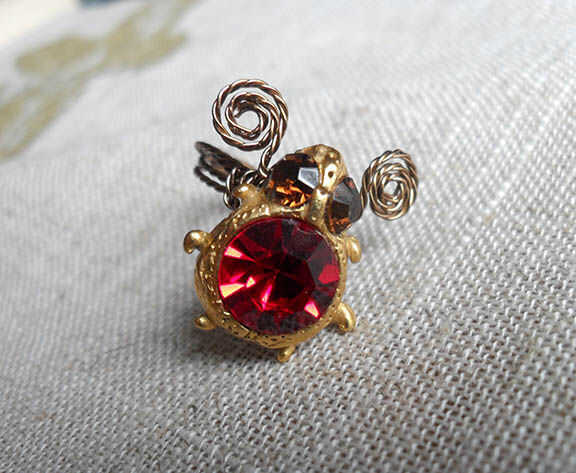 Anillos de botón también pueden ser un medio de la celebración de sus personas favoritas. El botón usado en este Ible, un error jeweled, es algo que recogió de un cubo de espacio tienda de tela más hace 10 años, mientras que las nociones de compras con un amigo que disfruta tanto como yo de bichos. Hice otra, muy diferente anillo usando un botón del vestido de la graduación que mi abuelo me compró, ya que la ropa sí mismo era demasiado pequeña para usar ya.
