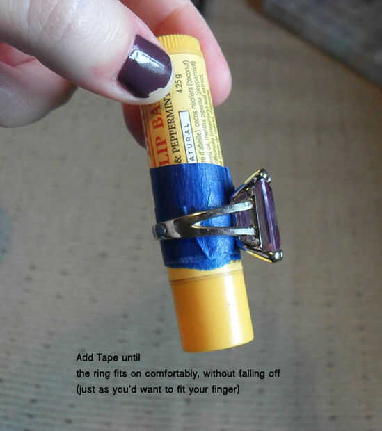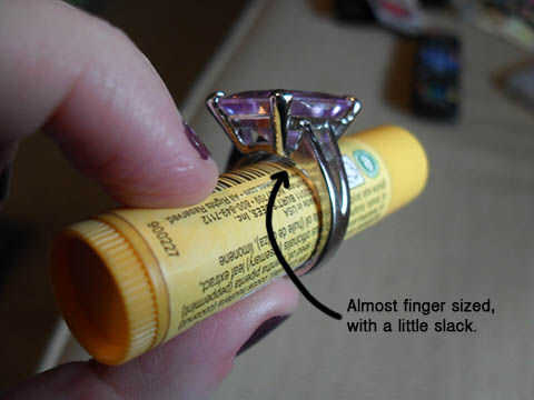 Utilizar una de tus propios anillos para ayudar a encontrar un hogar objeto de tamaño comparable. Para la mano de una mujer, encontrar chapstick es un buen lugar para empezar.