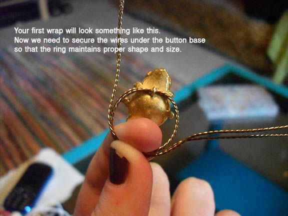 Use ambas manos para tirar de los pares de cables enseñó y mantener para el siguiente paso. La foto final es mostrar la forma del anillo se formó. Sugiero mantener su anillo atascado en la forma por ahora.