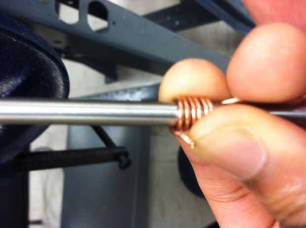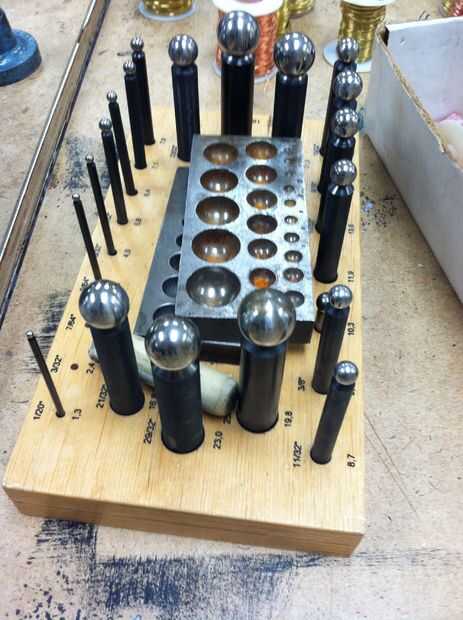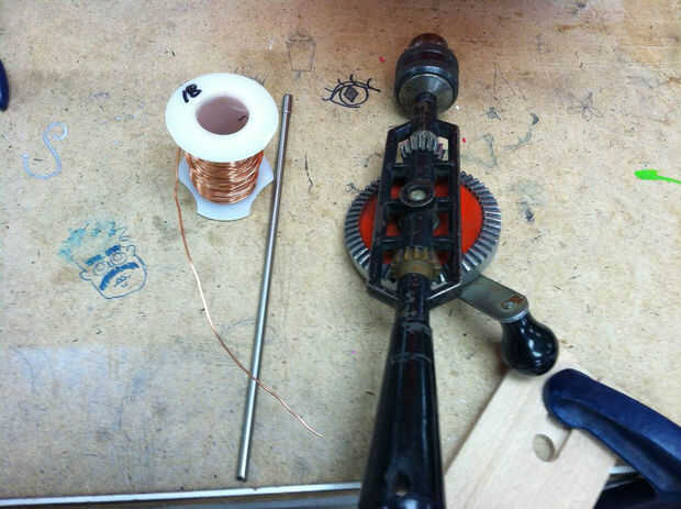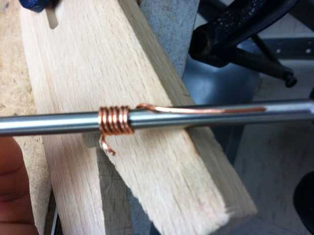 Usé los calibradores para medir el grosor del alambre 18 calibre, que vinieron a ser aproximadamente 1 mm. con algunas matemáticas y esto, resta el grueso calibre del diámetro total para obtener el diámetro ideal del objeto cilíndrico que se envuelve el alambre de cobre alrededor. Golpes abovedados son ideales para esto ya vienen en varios tamaños. Si no tienes golpes de gota de resina, hay otras cosas que se podrían utilizar, asegúrese de confirmar tamaños usando pinzas.