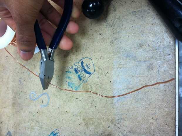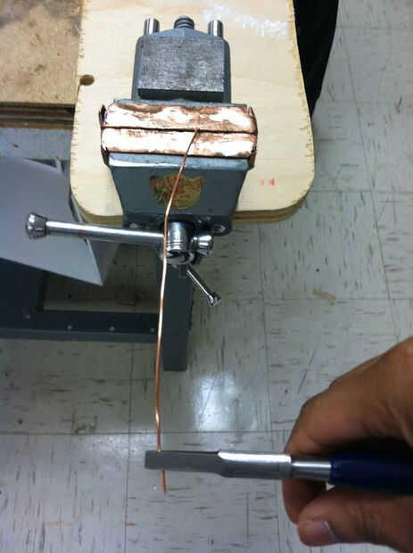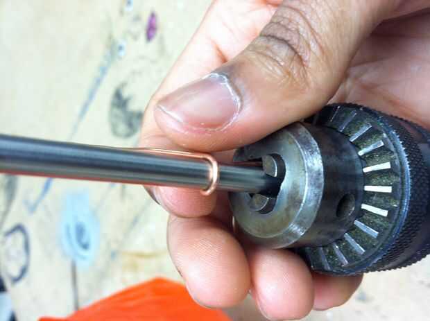 Una vez que se encuentra un tamaño ideal, coloque y apriete en el taladro de mano. A continuación, corte un pedazo largo de alambre de cobre. Para obtener círculos aseados, debe enderezar el trozo de alambre. Para ello, sujete un extremo en un tornillo de banco y mantenga presionado el otro extremo con los alicates. Apártese y tire el cable lejos de la prensa. El producto final debe ser una pieza de alambre relativamente recta.