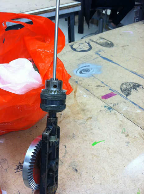 - Algo cilíndrico para pegar en el taladro de mano que le darán los tamaños de círculo adecuado.- Ej.: Sacador de domingo/Dapping, antenas de TV vieja, lápiz, etc..