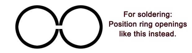 Oriente sus dos primeros anillos con las aberturas enfrentadas. Corte varios trozos pequeños de soldadura de plata. Aplicar flux al lugar donde se soldar. El flujo de calor hasta que el flujo espumejea blanco y luego se vuelve brillante. Una vez que el flujo se hierve apagado, añadir un trozo de soldadura de plata al punto y caliente la situación con el soplete hasta que se funde la soldadura.