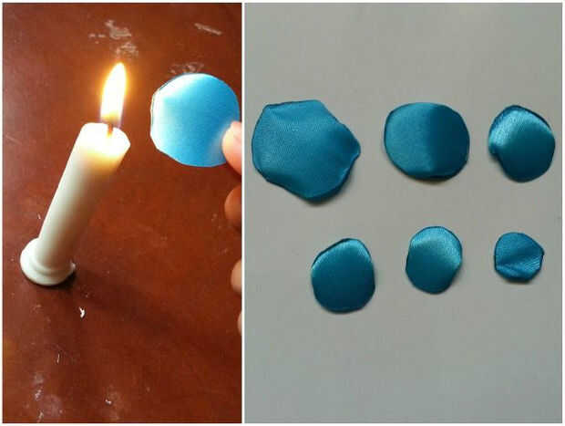 Para hacer las flores que tienes que cortar 4-6 círculos de tela de raso. He cortado de 6 círculos de 6 diámetros, el círculo más grande es de 1,5 pulgadas de diámetro y diámetro de los círculos más pequeños es aproximadamente 0,5 pulgadas y resto son entre 0.5-1.5 pulgadas. Esto depende de cuánto desea la flor a ser.