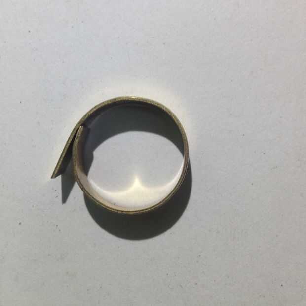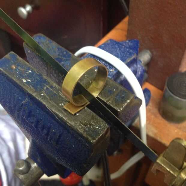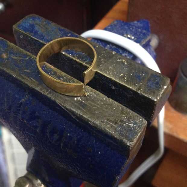 Doble y martillo alrededor de una forma cilíndrica de la barra de latón de 6mm hasta que su circunferencia es el tamaño del anillo que desea. Corte cualquier latón extra. Archivo plano y limpiar los extremos de la barra y encajar los extremos. Por último, soldar los extremos juntos.