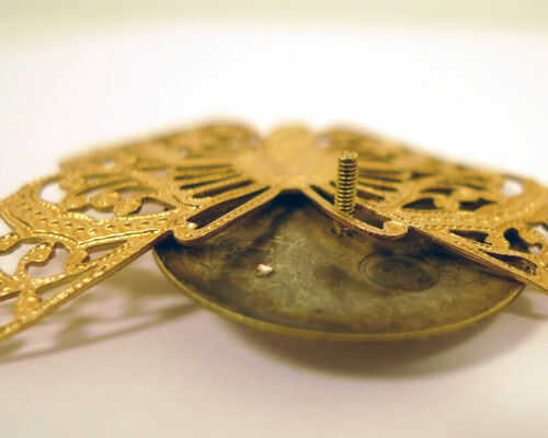 Con los dedos de las puntas de las alas de la mariposa la curva hacia arriba como se muestra. Asegúrese de dejar suficiente área plana en el centro de la mariposa de la cara del reloj. Colocar la mariposa sobre el anillo de filigrana oval y alinee las aberturas en las filigranas. Enrosque un tornillo micro por la parte delantera de la cara del reloj y luego por la filigrana mariposa y anillo.
