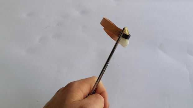 Aplicar algún pegamento para el timbre de la base y encolar el borde fino de venner a él.