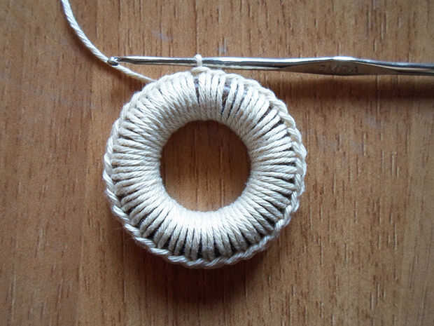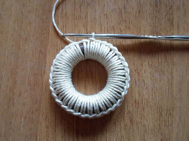 Ahora un anillo y sc tantos como necesita cubrir el anillo entero con hilo - debe trabajar todo el anillo. No hay un un definido número de sc ya que mucho depende el tamaño del anillo se utiliza.