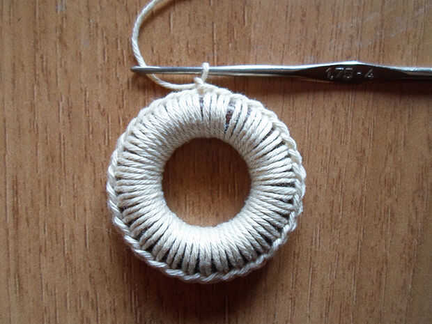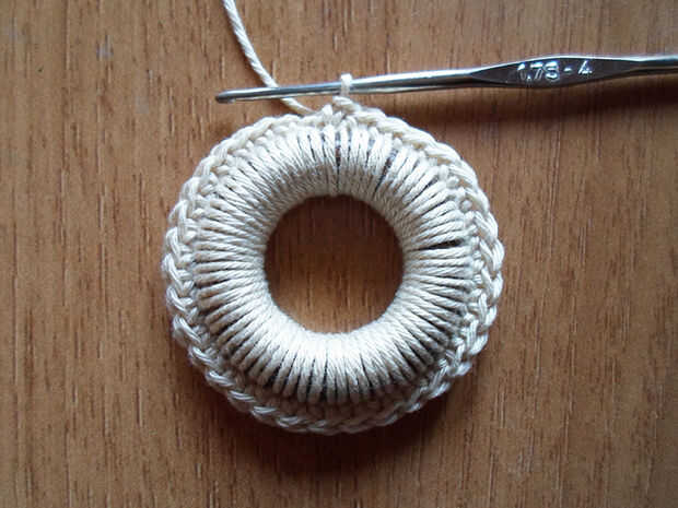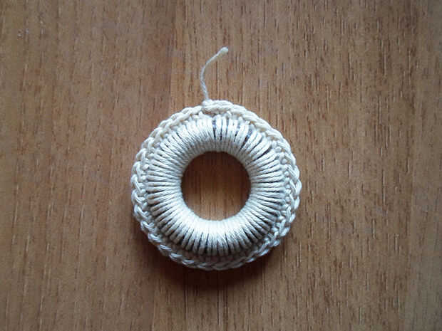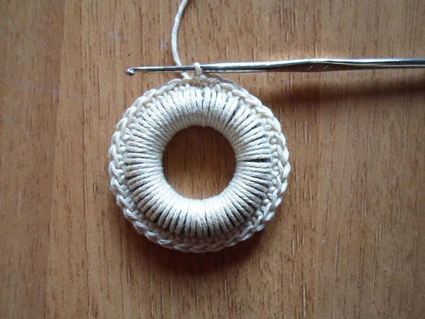 1 de la cadena y hacer otra fila de sc, todo alrededor del ring, en la sc que hiciste anteriormente. Cuando termina el círculo, hacer un resbalón en la primera cadena de puntada y cierro todo, cortar el hilo.