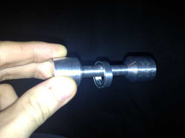 7.) después de que las barras se cortan a su diámetro final, uso la subvaloración de la herramienta para tallar 'cuidadosamente' el espacio entre la sección media y el diámetro de la barra de base. Te recomiendo cortar por la mitad y voltear la pieza en el torno para terminar el otro lado hasta que salga libre. Una vez que el anillo se rompe parar el torno.