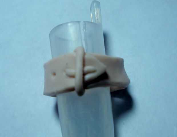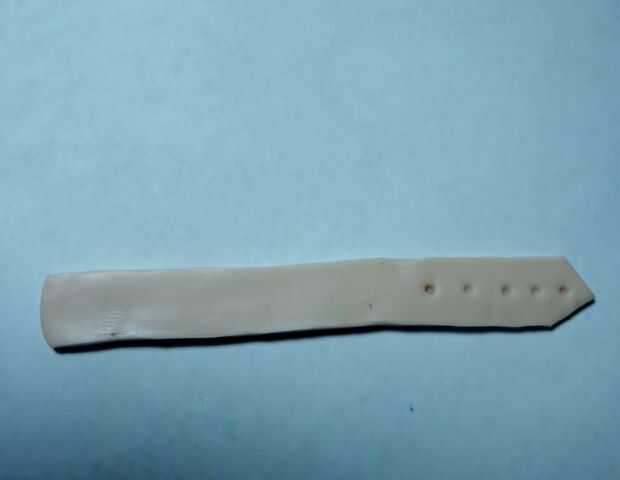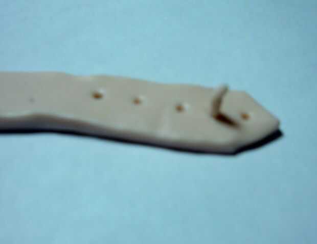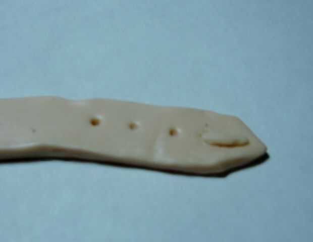 Use un lápiz para hacer pequeñas abolladuras / orificios. Poner un trozo pequeño de arcilla de la mella segunda. Doble hacia abajo. Sobreponga los extremos. Aplanar el extremo inferior un poco. Poner una pequeña barra de arcilla alrededor de los extremos.