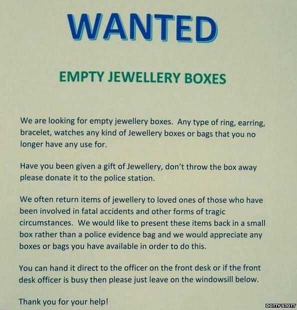 Un llamamiento para donar cajas de joyería para que quienes han perdido seres queridos tengas elementos devueltos con "compasión" se ha iniciado en una estación de policía. Carteles se pusieron a Ely en Cambridgeshire, preguntando a la gente a donar cajas para anillos, aretes, pulseras y relojes. Oficial de enlace familiar Dotty Stott dijo que estaba segura sería una "diferencia enorme" a las familias de las víctimas. "Trabajamos con eventos muy, muy tristes y en el proceso de que volver joyas personales de los seres queridos a los miembros de su familia - que generalmente se ha realizado en el hospital, o en nuestras bolsas de propiedad de la policía," dijo Ms Stott.