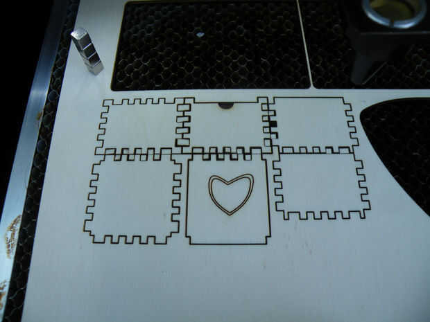 Tal y como está, este diseño es 120 x 70 mm en la cama de corte - mayoría de los dueños de la cortadora láser tendrán acceso a un trozo de material de ese tamaño. En mi pequeño cortador, tardó menos de tres minutos para grabar las vacaciones miniatura, dibujar en el corazón y cortar todas las piezas.