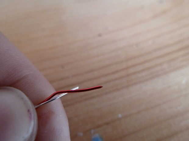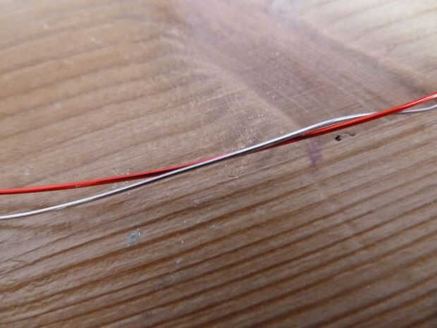 Corte el cable. Si quieres hacer un anillo de dos colores, dos colores de hilo de corte en la misma longitud. Girar un poco en otro como se muestra.