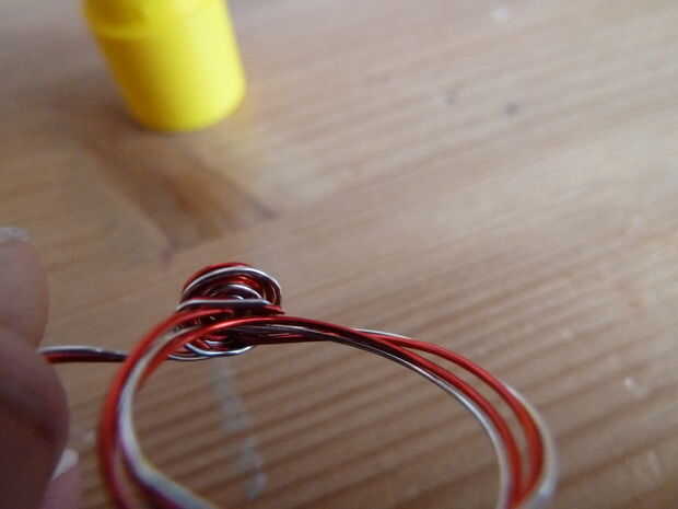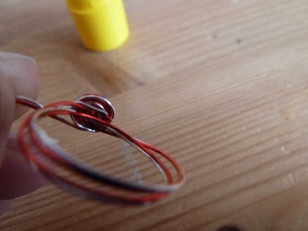 Se puede trabajar el cable lejos de 1. envuelve por debajo el círculo y corte de o 2. envolviéndolos alrededor del anillo. Estos son los dos teqniques que utiliza para los dos anillos que se muestra, la primera para el anillo del color, el segundo para el anillo de color plateado.