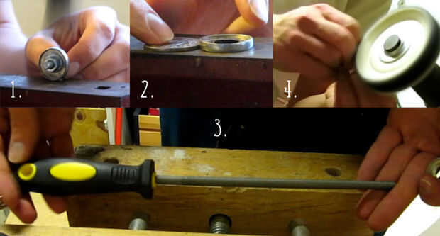 A partir de ahora dosis no importa qué método de balanceo a la moneda su uso... Coloque la moneda con la cara sobre su yunque, como se muestra en "1.". Que agarra el martillo y empezar a grabar. Grifo a menudo y casi solo deje el martillo caer la moneda con su propio peso. No dejes de papel moneda, uniformemente extensión deformación es preferir! Puede tomar hasta 15 minutos antes de que se puede ver cualquier cambio en todos. Si tu destacando y empezar a golpear la moneda dura en cambio comenzará a curva y todo el proyecto está arruinado...