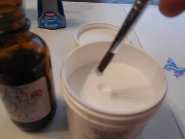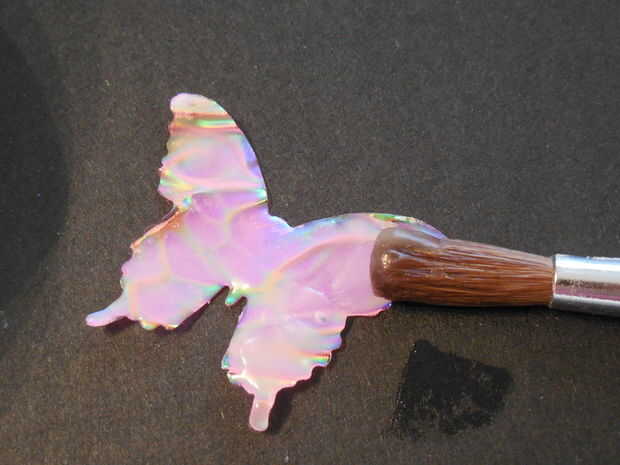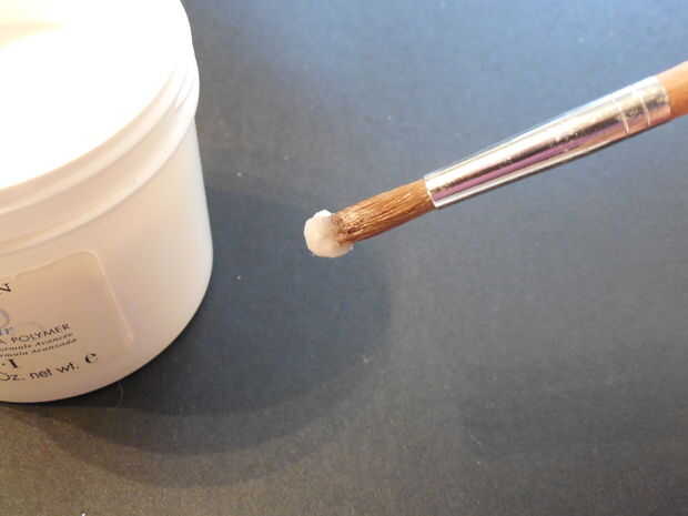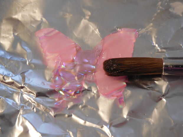 Sumergen el pincel en el monómero después pegan en el polvo, se crear un grano que parece semi transparente, coloque sobre la mariposa, aplanar, barrido de la escobilla en la toalla de papel, hacer esto después de cada gota, esto impide que la acumulación, a continuación, repita el paso. Al terminar el frente, voltear y hacer el otro lado.