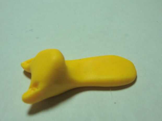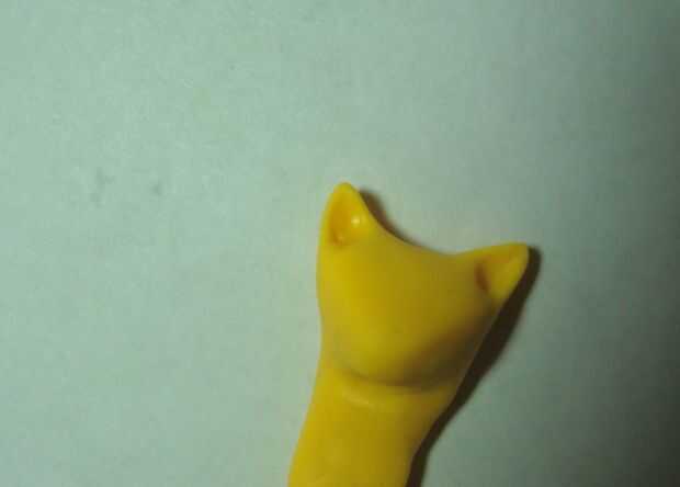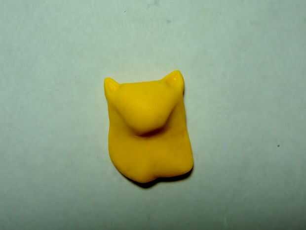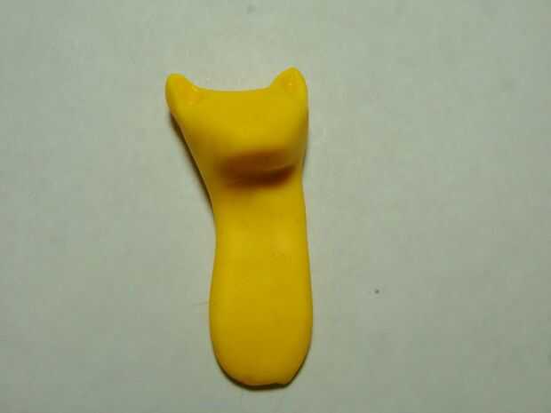 Forma de cara de gato. Empuje el resto de la arcilla. Forma de la arcilla extra en el cuerpo del gato. Lisa por la parte trasera de la cabeza del gato.