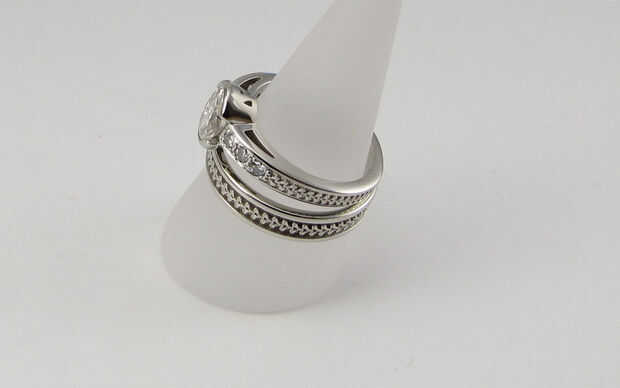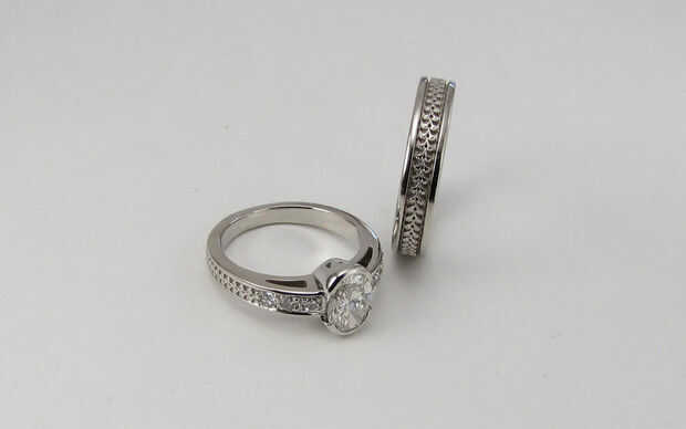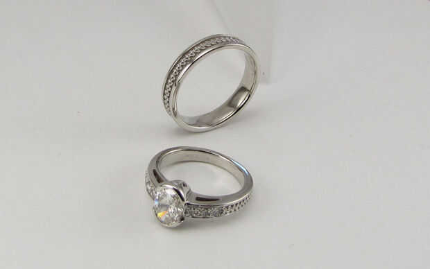 En este caso también ver imágenes del modelo en cera y aprobar el diseño una vez más antes de que se echa en oro blanco. En las imágenes se puede ver el frasco que contiene el modelo de cera es quemado o desintegrado bastante para hacer un vacío que se llena con metal fundido, este casting se realiza en oro blanco de 14 k. De este punto que el casting es acabada a mano y el diamante son sistema de la mano. Y luego entregado a la feliz pareja.