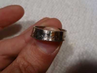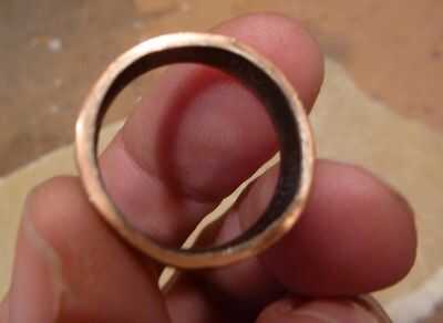 En esta demo, he usado un cuarto de los Estados Unidos. El borde exterior de un cuarto tiene un labio levantado y este labial es muy pronunciado en mi anillo de la demostración. Ver la imagen. Se puede lijar fácilmente este labio apagado. Usted probablemente querrá lijar de todas formas para eliminar cualquier muescas o ranuras del borde la moneda tenía para comenzar con. Comience con una lija de 150 grano. Cinta del papel de lija sobre una superficie plana. Ahora simplemente frotar el anillo hacia atrás y hacia adelante hasta que te has de quitar la mayoría de los labios o surcos. Asegúrese de girar el anillo con regularidad para evitar que la banda desigual.