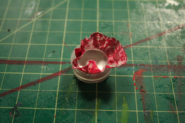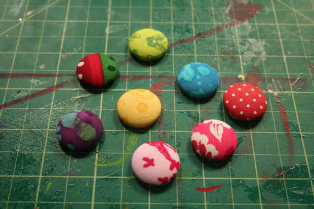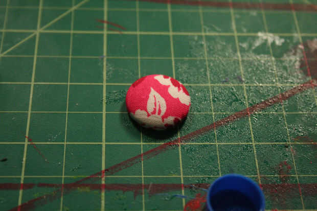 Desde allí, coloque el lado equivocado del círculo de la tela hacia arriba dentro del molde, incluyendo el kit y coloque un botón shell en la parte superior. Meta en la tela y coloque la parte inferior sin la caña en la parte superior, presionando hacia abajo con el empujador incluido que encajen en su lugar.