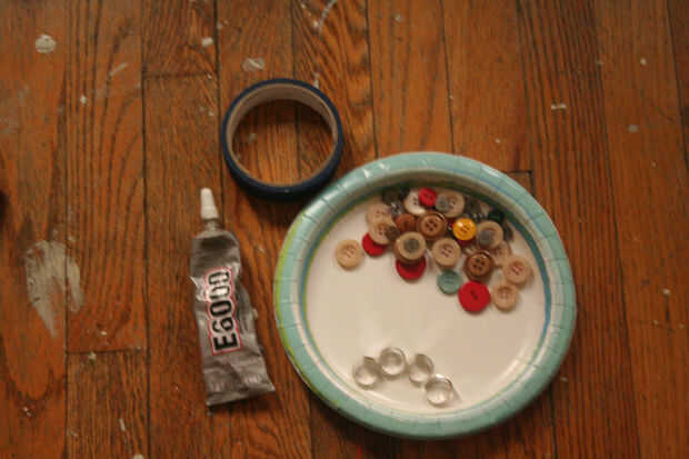 Esta divertida, colorida idea para los anillos de botón blinged arriba cruza dos proyectos encontradas Página Web de Joann: anillos de botón cubierto y botones y collar Bling.Paso 1: materialesAquí es lo que necesita hace estos lindos anillos con mot