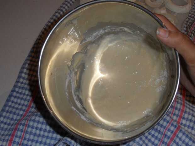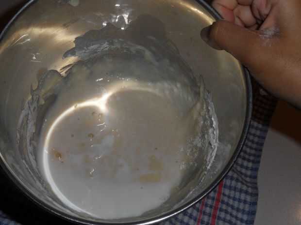 3. mi masa se volvió espesura así que agregamos más leche al fina hacia fuera para facilitar la inmersión de la cebolla.