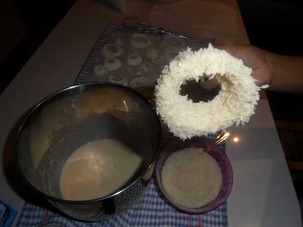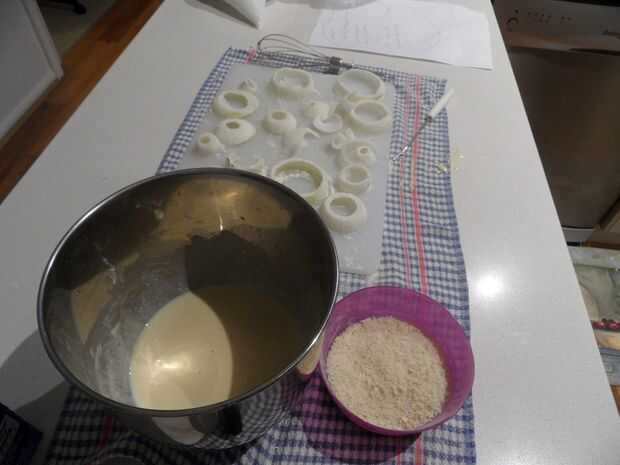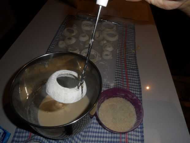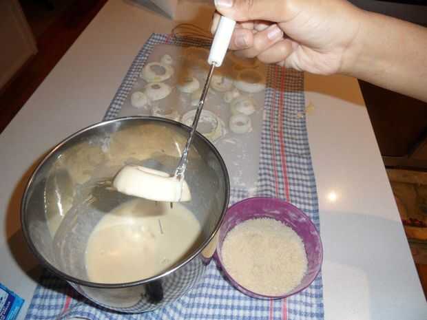 2. utilizando una pinza o un pincho, sumergir un aro de cebolla en la mezcla.