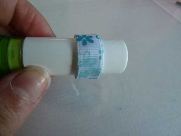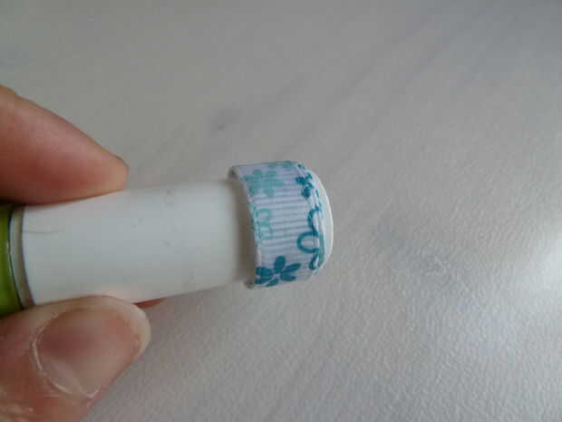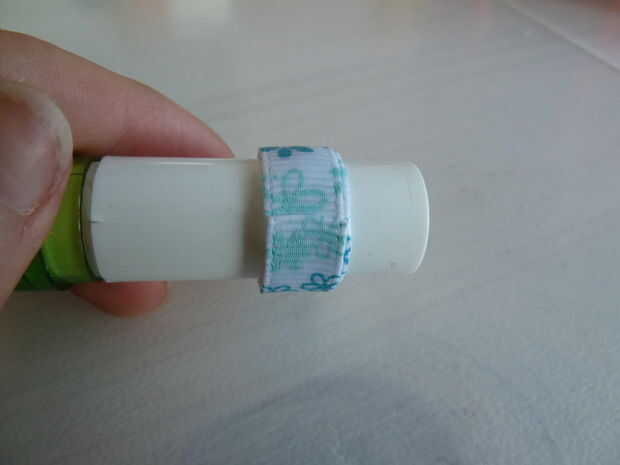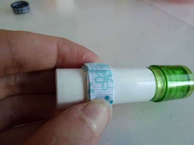 Para finalizar el anillo, use sus tijeras para hacer un corte recto, suave para terminar la cinta. Agregar el pegamento al final y ponerlo en la otra parte del anillo. Use su pulgar para pulsado al final hasta que el pegamento haya secado un poco más. Cuando tiene, se aplica un extra poco de pegamento a la conexión del anillo y el final de la cinta. Espere a que el pegamento se seque por completo.