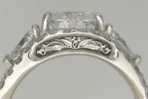 El primer anillo fue una tarea especialmente desafiante como la abertura en el lado del anillo es sólo de 8mm de ancho. Las secciones de la vid están hechas de catorce piezas separadas de platino. Alambre de platino que es .07mm grueso (aproximadamente.003 pulgadas) se utiliza para las vides y las hojas fueron cortadas de la hoja de platino, mano grabado y soldado con autógena a las secciones de la vid. Las secciones de la vid montado entonces fueron insertadas en la 8mm ancho de apertura y después soldado con autógena en lugar de la parte trasera. Es un anillo muy pequeño-para poner en perspectiva las piedras de lado en la parte superior del anillo están de 1 mm de diámetro.