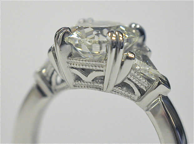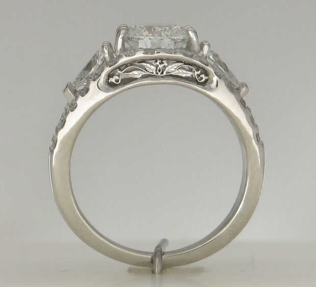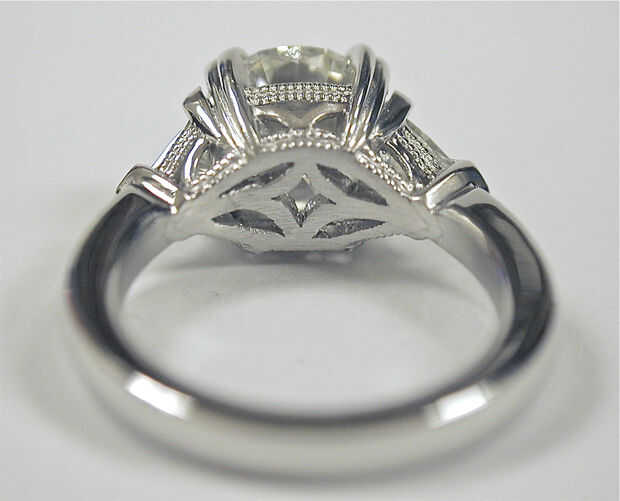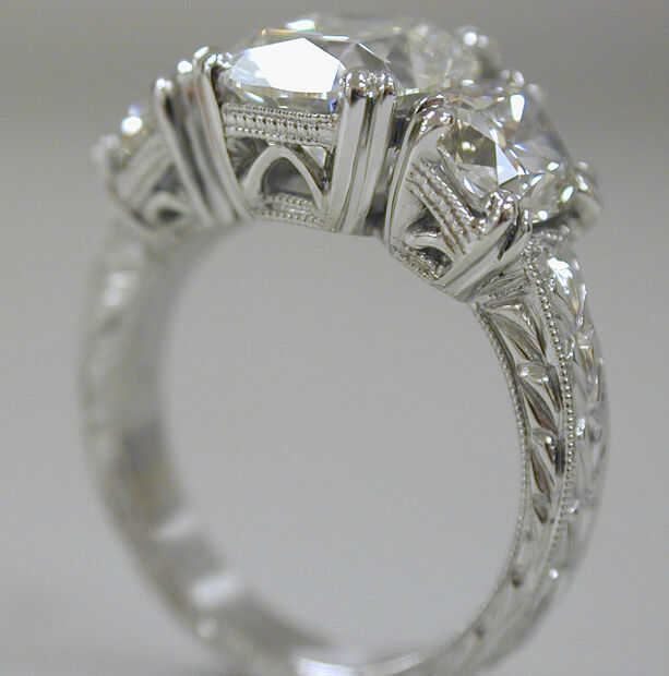 Los dos anillos están hechos completamente de hoja de platino y bastidores de alambre no se usaron y hay más de cuarenta uniones soldadas en cada anillo. Para hacer anillos como estos empiezo con la cabeza del centro formando las clavijas y los cables de la galería, doblado a la forma y junto a ellos juntos. Las clavijas y los cables de galería para las piedras de lado entonces se agregan, prestando mucha atención a la separación de piedra. La caña del anillo entonces es mano forjada, formado y conectado al ensamblaje del cabezal. El anillo es de luego pre pulido y las piedras son set y luego el detalle se hace mano trabajo grabado, seguido por el pulido final.