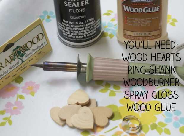 Vas a necesitar algunos corazones de madera (he encontrado mina en JoAnns), una caña del anillo, algún pegamento para madera, brillo sellador y una estufa de leña. Simplemente trazar las iniciales o una palabra en el corazón y quemarlo usando una punta fina en su estufa de leña. También quemé los bordes del corazón con una punta plana. Spray con brillo y dejarla secar. Use pegamento para madera para sujetar a la caña del anillo y yer hecho!