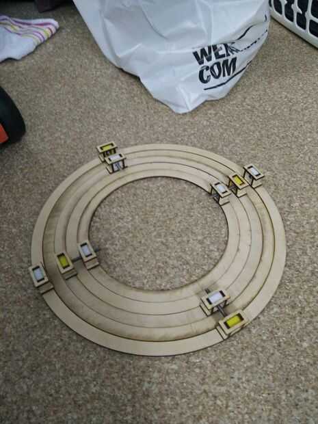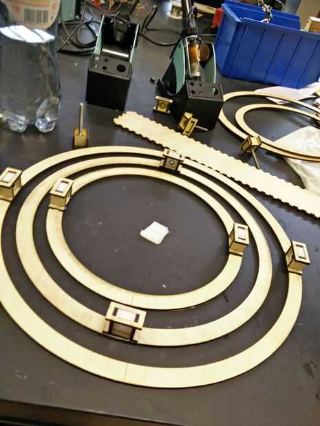 Los anillos con la lasercutter deben ser conectado a través de árboles procedentes de otro anillo. Esto se hará por pegar los adaptadores a los anillos de madera con cuidado.