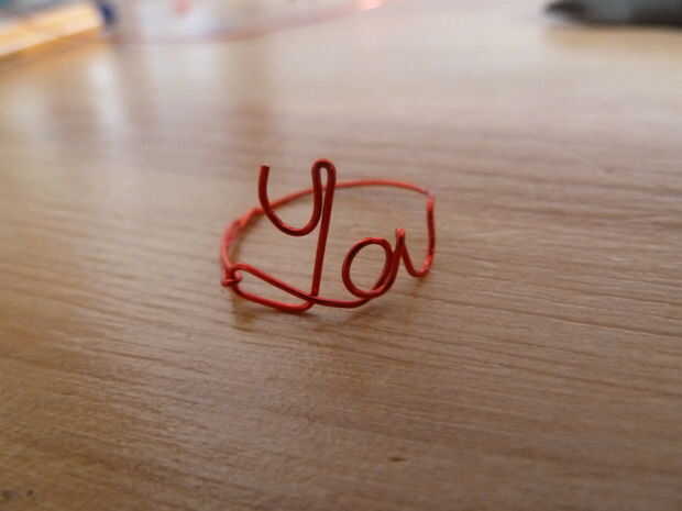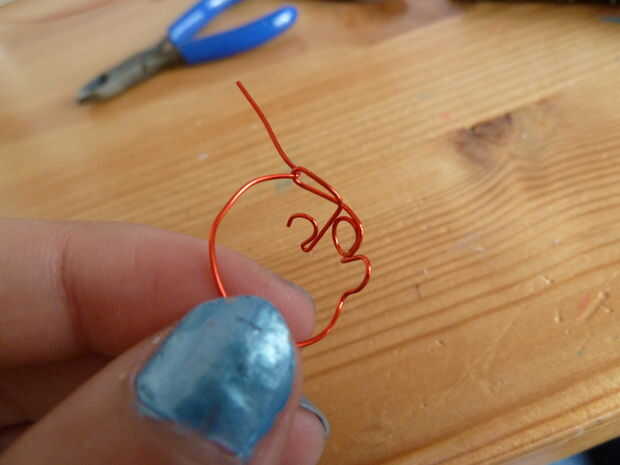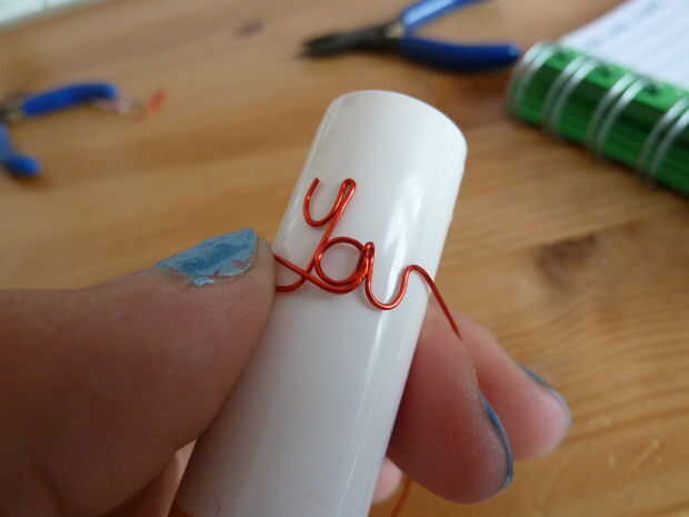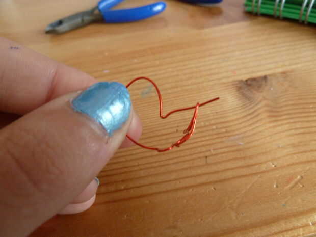 La segunda foto muestra dónde doblar el alambre hacia atrás. Cuando hayas doblado detrás, ponerlo a través de la primera letra.