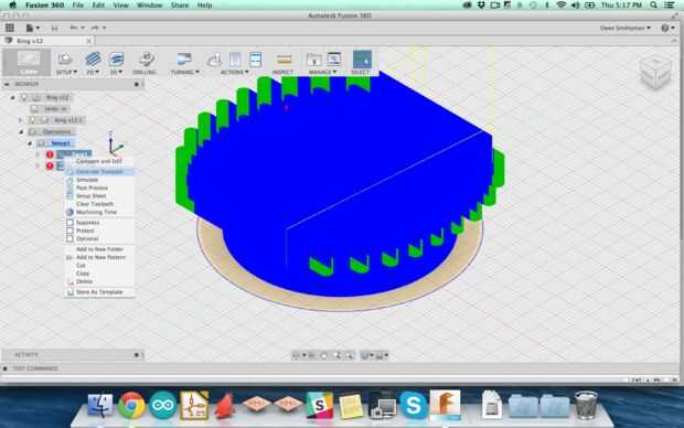 Fusión se calcular las trayectorias de herramienta y mostrar todo el modelo. Si el modelo de anillo es la altura exacta de su acción, obtendrá un poco amarillo ADVERTENCIA icono junto a la trayectoria de Face1, pero puede ignorar ya que no necesitan esa trayectoria.