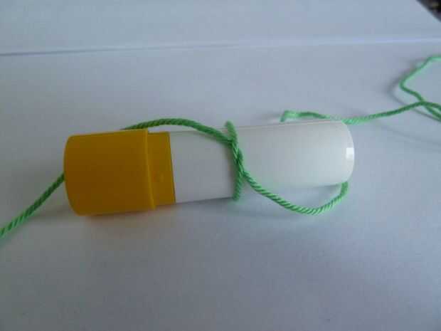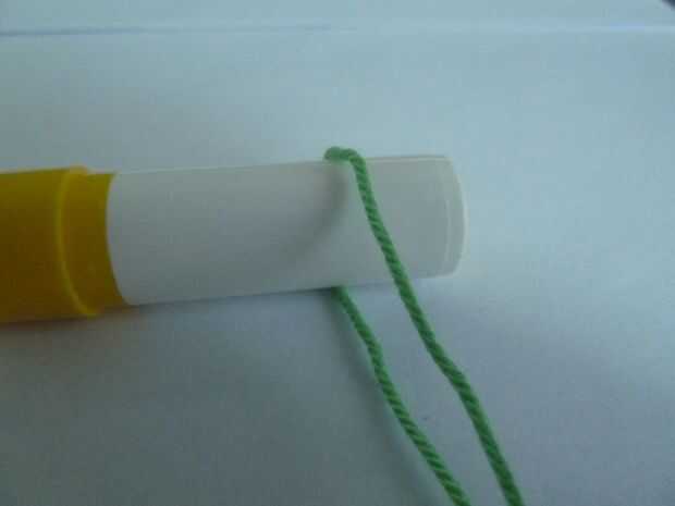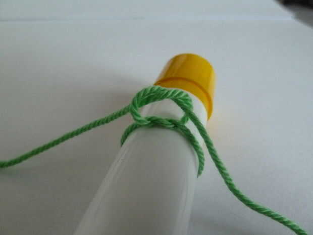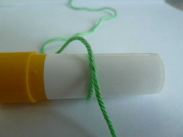 Doblar el hilo por la mitad y poner alrededor del objeto redondo, asegurándose de que se divide por la mitad uniformemente. Cuando hayas hecho esto, hacer un nudo simple con los dos extremos. Este es un buen momento para asegurarse de que ambas mitades tienen la misma longitud. Cuando se ha comprobado, hacer un segundo nudo para asegurar el primero de ellos. Ahora puede llevar el anillo el objeto redondo y empieza con el macrame!