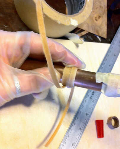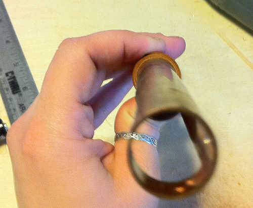 Después de que el anillo ha sido estar sentado 5 o así minutos, suavemente Retire la cinta adhesiva y deje que se despliega lentamente. La madera debe ahora formar un espiral flojo. A partir de la mitad, comenzar envolviéndola firmemente alrededor del tubo otra vez. Tan pronto como tienes un bucle formado, poner una pequeña cantidad de pegamento (menos de una gota) en la tira de chapa derecha donde la parte sin envasar se encuentra con la parte envuelta, extenderla un poco con la punta de la cola. Presione firmemente la chapa en su lugar. Mantenga pulsado durante unos segundos hasta que llevará a cabo en su propio. Tenga mucho cuidado en las primeras aplicaciones de la cola. No quiero pegar el anillo en el tubo que está utilizando. Si usted está nervioso acerca de tus habilidades, podría envolver papel pergamino alrededor tu tubo antes envolviéndolo. Yo generalmente Deslice el anillo hacia arriba y abajo el tubo un par de veces cuando estoy pegando la primera capa para asegurarse de que no se pega. Mantenga la adición de pequeñas cantidades de pegamento, difundirla y presionar la chapa contra la capa inferior, sujeta firmemente mientras se trabaja hacia afuera en una espiral. No omitir las áreas. El anillo es fuerte y se ve mejor cuando no hay huecos ni manchas sin pegamento.