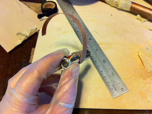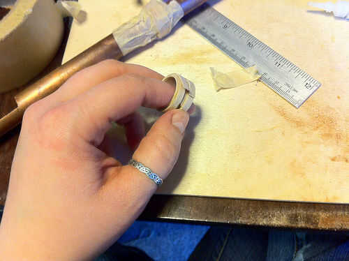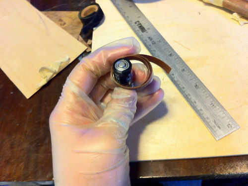 Estaba cansado de lijado pegamento de mis dedos cuando estas fotos fueron tomadas, razón por la cual estoy usando guantes. Siempre termino con pegamento en mis dedos cuando hago anillos de madera doblados.